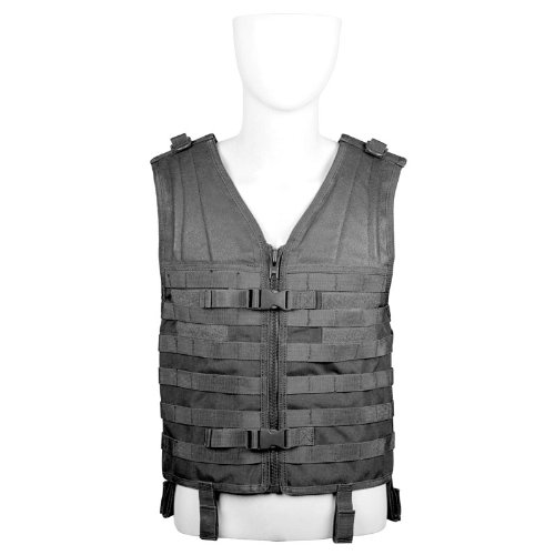 - Webbing over entire vest with the number of attachment points for the modular pouches. - Two quick-release buckle in front, padded shooter with stock stopping rubbing on both shoulders, and one emergency drag handle on the back. - Hanging loops for pistol belt or duty belt. - Internal mesh zippered map pocket and utility pocket one side each. - Import - One size adjustable from M - XLModel : MV-002
